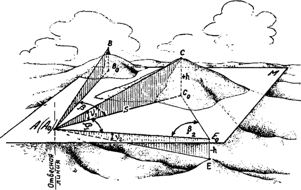 - направления линий местности АВ, АС и АЕ проектируют вертикальными плоскостями АВВо, АССо и АЕЕо , проходящими через отвесную линию в точке А, на горизонтальную плоскость М и в пересечении вертикальных и горизонтальной плоскостей получают горизонтальные проложения (АВо, АСо и АЕо);